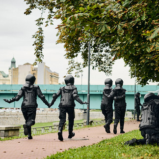 Processing the emotional range between being ignored, trusted, feared, and laughed with is something that stays with me. Approaching people as an anonymous identity inside a uniform of power is delicate work — it requires both distance and deep empathy, depending on the situation. Throughout the performance, I registered reactions from compassion, cooperation, and understanding, to suspicion, indifference, and occasional mockery — which, as usual, came from misunderstanding. Being met with so many different emotions can feel overwhelming, and in such a striking costume there is nowhere to hide. In those moments, the best thing for me was to draw close to someone from the group, meet their eyes with trust, and let myself be held — by the hand or in an embrace. Simply to experience the moment together, to care for one another, to offer gentleness.