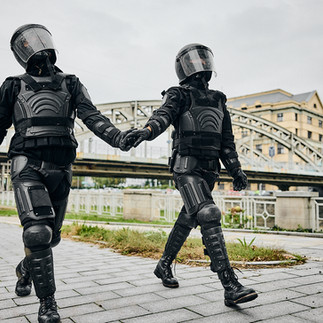 Even this initial moment was a fascinating experience for me — I had never worn something so clearly defining authority and the right to act, while simultaneously imposing physical limitation and clumsiness. Even ordinary walking became a forced spiral movement due to the body armor. Not to mention the impossibility of fully lifting one’s arms, the helmet fogging up, or the private sauna effect happening inside the suit.